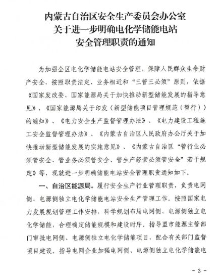 近期,內(nèi)蒙古自治區(qū)安全生產(chǎn)委員會(huì)印發(fā)《關(guān)于明確電化學(xué)儲(chǔ)能電站安全管理職責(zé)和電化學(xué)儲(chǔ)能電站消防安全管理若干措施的通知》(簡稱《通知》)。