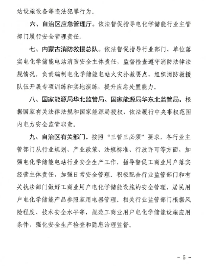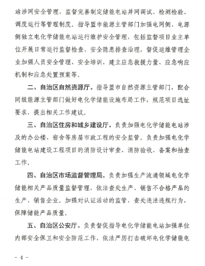 《通知》主要包含兩部分:一部分是明確了自治區(qū)能源局、自治區(qū)自然資源廳、自治區(qū)住房和城鄉(xiāng)建設(shè)廳、自治區(qū)市場監(jiān)督管理局、自治區(qū)公安廳、自治區(qū)應(yīng)急管理廳、內(nèi)蒙古消防救援總隊(duì)、國家能源局華北能監(jiān)局和東北能監(jiān)局等部門在儲(chǔ)能電站安全管理上的職責(zé)。